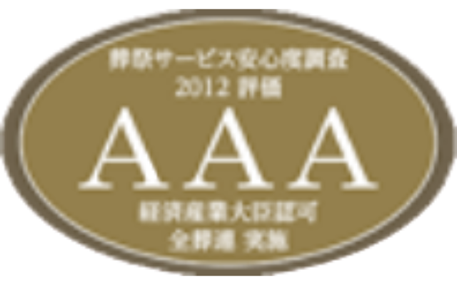 経済産業大臣認可全葬連による「葬祭業安心度調査」において、全国の葬儀社1,629社の中、123社のみが認定される「トリプルA」の最高評価をいただきました。