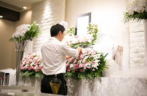 当社の大きな特徴として挙げられる点のひとつは、自社にフラワー事業部があることです。フラワー事業部は花の仕入れから生花祭壇などの設置までを行っています。故人様やご遺族様のご要望をより明確に反映することができるだけではなく、自社で一括して担当できるので中間マージンがかからない点も強みです。