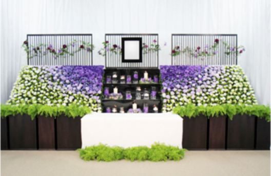 神聖な雰囲気を醸し出す、紫と白のコントラストが美しい生花祭壇です。