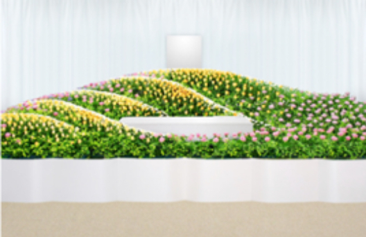 まるで花が咲き誇っている丘のような曲線状の生花祭壇です。