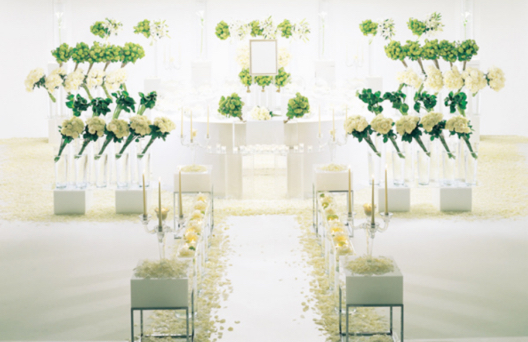 さわやかな白とグリーンで構成されたスクウェアデザインの生花祭壇です。