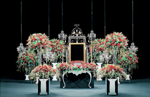 真紅の花をメインに構成された、荘厳なイメージの生花祭壇です。鉄製のモニュメントと硝子のシャンデリアが美術品のような華やかさと美しさを引き立てます。