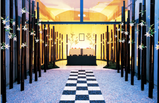 竹をあしらった和テイストの祭壇に白ユリを装飾したデザイン生花祭壇です。可憐で美しい白ユリが会場の荘厳な雰囲気を引き立たせ、参列者の心に訴えかけます。