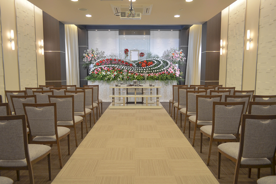 シャンデリアが優雅に輝く式場は、厳かな雰囲気の中で大切な方をお見送りできる空間です。さいたま市で葬儀や家族葬をお考えの方に、心に残るセレモニーをご提供します。