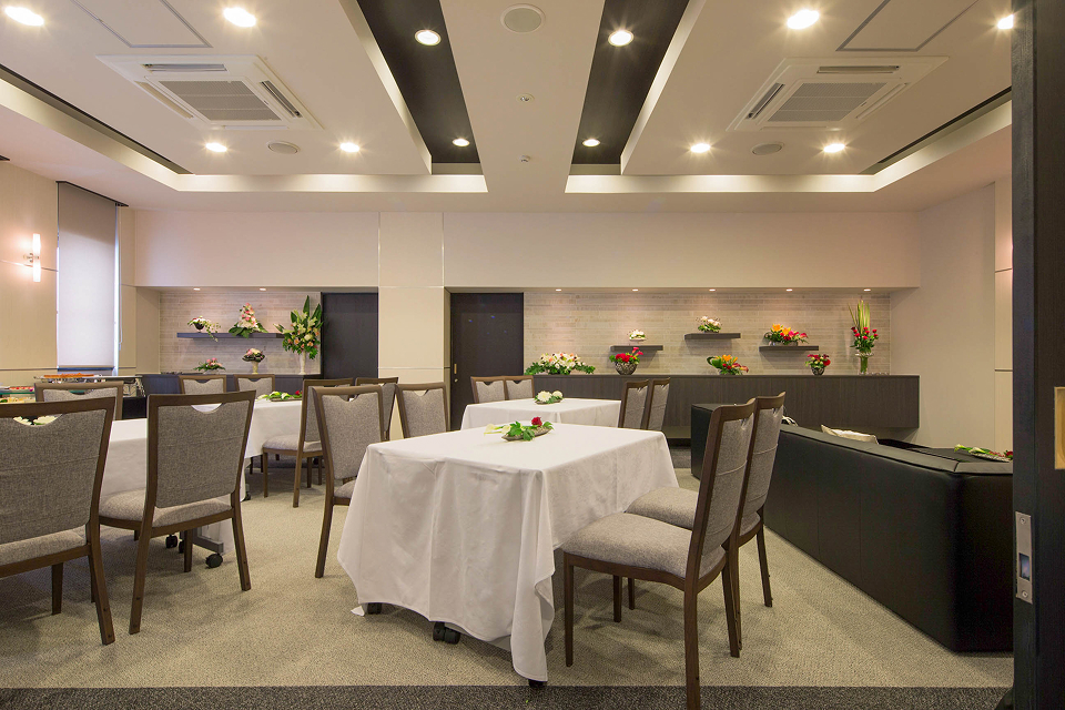 ご会葬後に故人様を偲びながらゆったりとお食事ができる会食室。さいたま市での葬儀後のご会食にふさわしい、落ち着きと温もりのある空間をご用意しています。