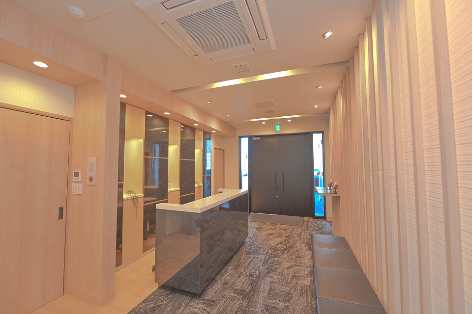明るく開放感のある受付・ロビー空間。ご参列の皆さまを穏やかにお迎えする、上質なホスピタリティを感じる設えです。