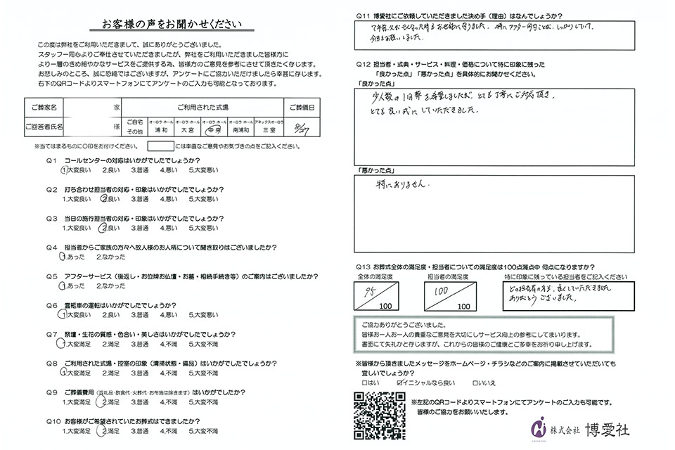 博愛社では、葬儀を終えられたご遺族の方にアンケートにご協力いただき、より良いサービスの提供に努めております。