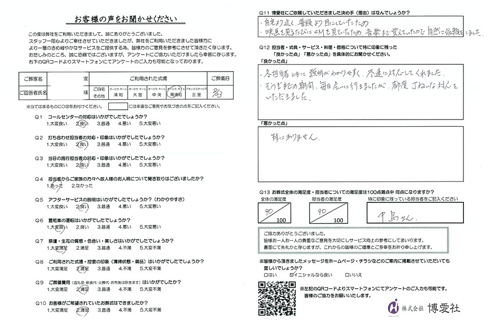博愛社では、葬儀を終えられたご遺族の方にアンケートにご協力いただき、より良いサービスの提供に努めております。