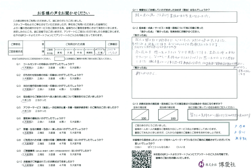 博愛社では、葬儀を終えられたご遺族の方にアンケートにご協力いただき、より良いサービスの提供に努めております。