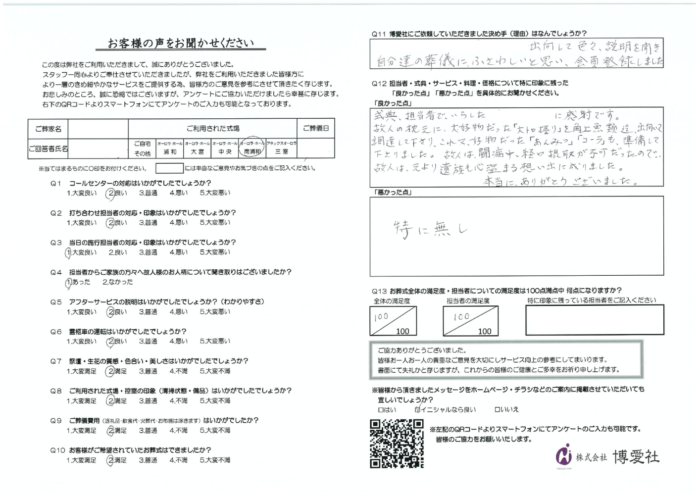 式典の担当者の方に感謝です。故人の枕元に、大好物だった「大トロ握り」を角上魚類迄、出向いて調達して下さり、これ又、好物だった「あんみつ」「コーラ」も準備して下さりました。故人は闘病中、経口摂取が不可だったので、故人は元より遺族も心温まる思い出に成りました。本当にありがとうございました。