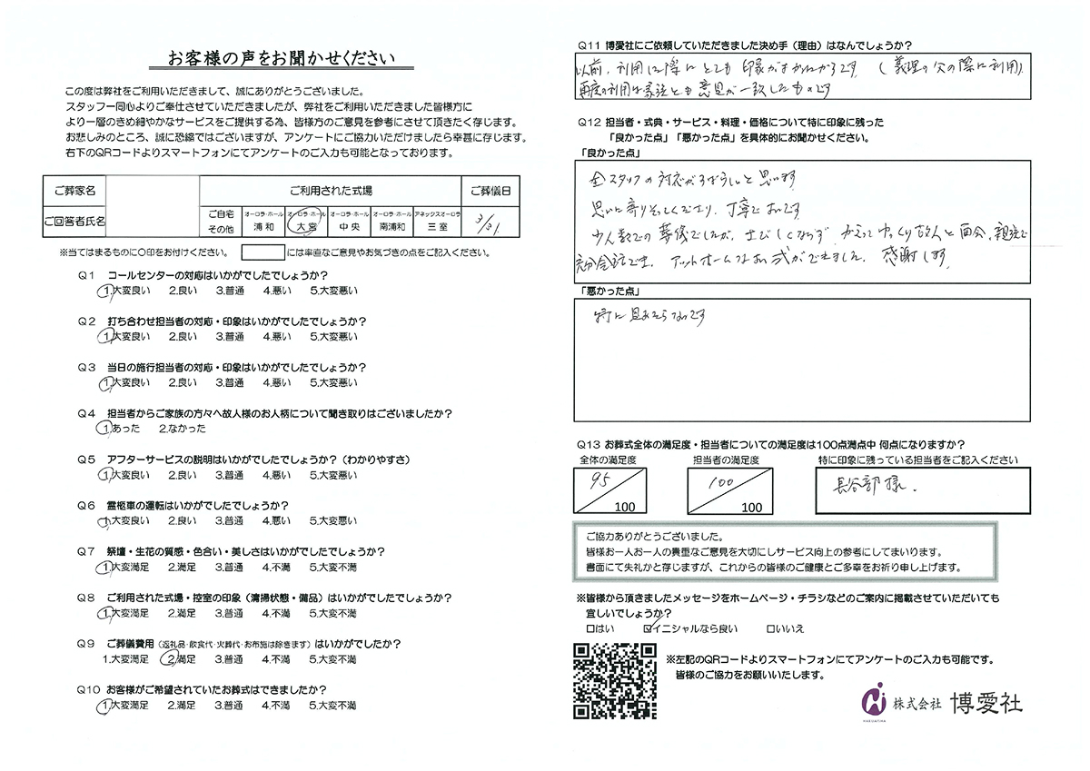 博愛社では、葬儀を終えられたご遺族の方にアンケートにご協力いただき、より良いサービスの提供に努めております。