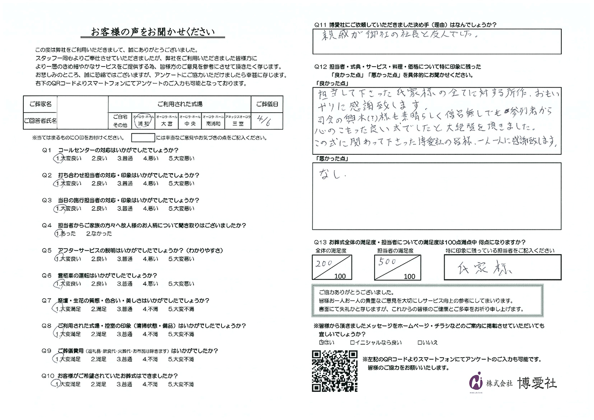 博愛社では、葬儀を終えられたご遺族の方にアンケートにご協力いただき、より良いサービスの提供に努めております。