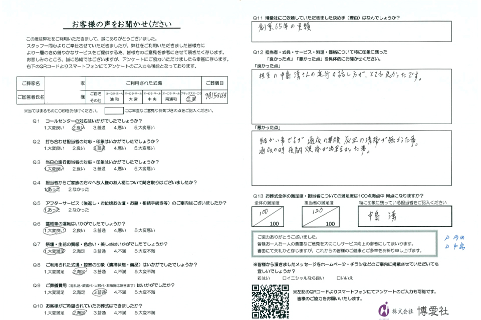 博愛社では、葬儀を終えられたご遺族の方にアンケートにご協力いただき、より良いサービスの提供に努めております。
