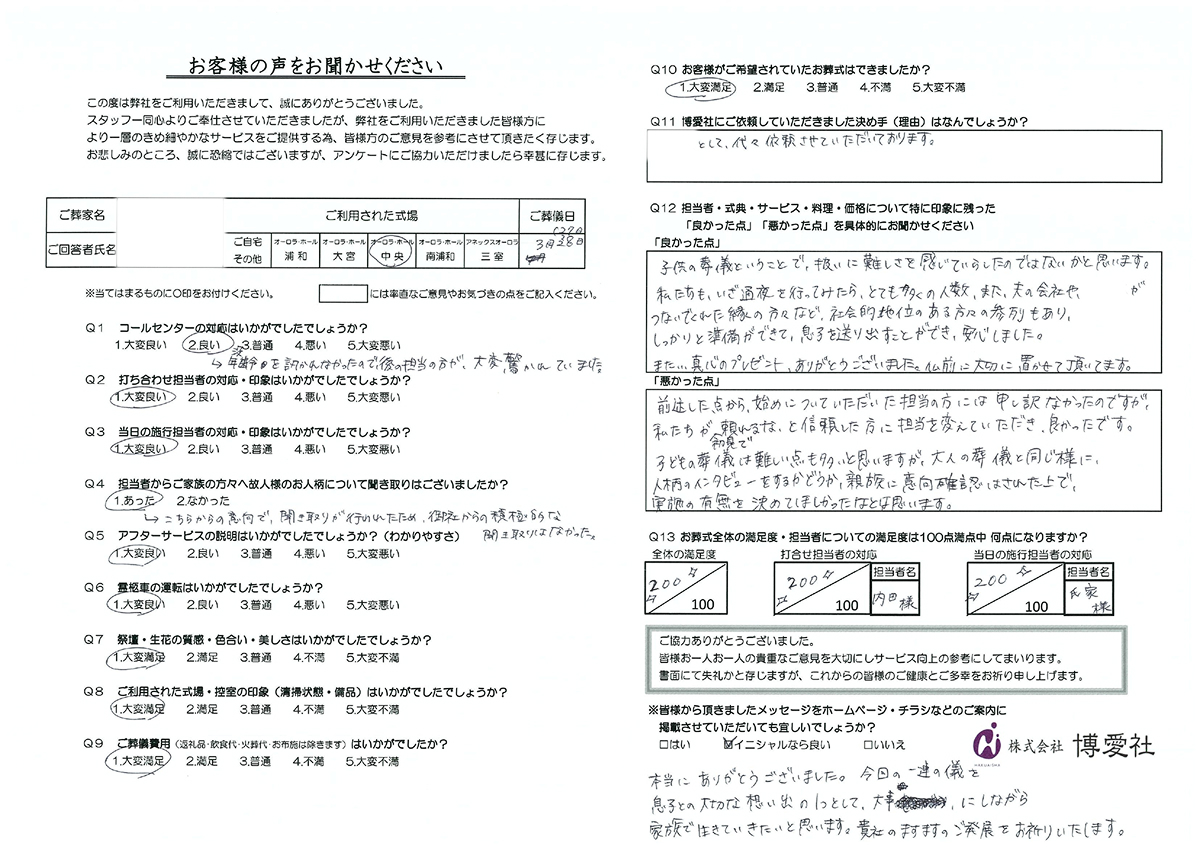 博愛社では、葬儀を終えられたご遺族の方にアンケートにご協力いただき、より良いサービスの提供に努めております。